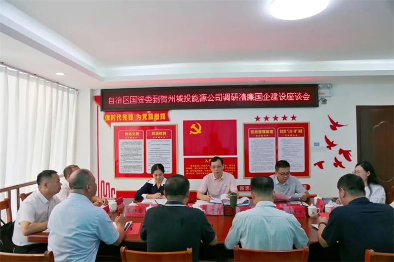 9月10日,自治區國資委黨建工作處一級調研員肖加洲率隊深入賀州市城投能源發展有限公司調研督導清廉國企建設。賀州市國資委黨委書記、主任黃源就,黨委委員、副主任莊毅斌,城投集團黨委書記、董事長黃俊,黨委副書記、工會主席梁輝露陪同調研。