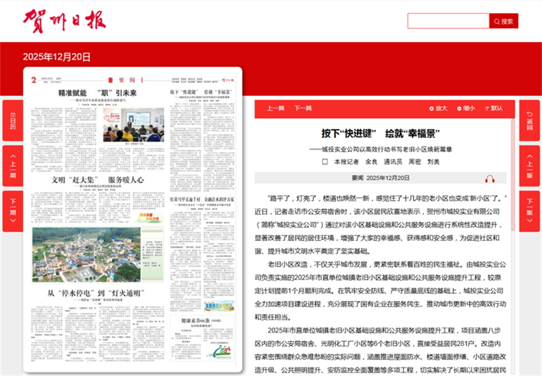 發(fā)布時(shí)間:2025-12-22 作者:文字:賀州日報(bào) 來源:本站原創(chuàng) 審核:“路平了,燈亮了,樓道也煥然一新,感覺住了十幾年的老小區(qū)也變成‘新小區(qū)’了。”近日,記者走訪市公安局宿舍時(shí),該小區(qū)居民欣喜地表示,賀州市城投實(shí)業(yè)有限公司(簡稱“城投實(shí)業(yè)公司”)通過對該小區(qū)基礎(chǔ)設(shè)施和公共服務(wù)設(shè)施進(jìn)行系統(tǒng)性改造提升,顯著改善了居民的居住環(huán)境,增強(qiáng)了大家的幸福感、獲得感和安全感,為促進(jìn)社區(qū)和諧、提升城市文明水平奠定了堅(jiān)實(shí)基礎(chǔ)。